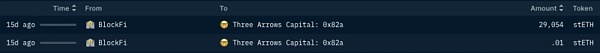 6 月 7 日 1:41,钱包 A 从 BlockFi 提取了一大笔的 29054 stETH,并直接将其发送到钱包 B。不久之后,收到的 9710 stETH 作为质押品存入了 Aave。