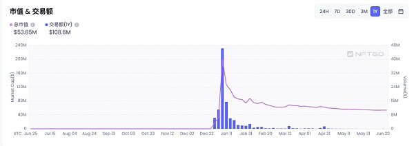 NFT市场经历了短暂爆发后逐渐步入「冷静期」。根据NFTGO 6月24日的数据,NFT市场总市值已由今年2月366亿美元的高点跌至226亿美元,跌幅超过38%。NFT单日交易额由33.94亿美元的高点跌至1.5亿美元左右,下降了95.5%。