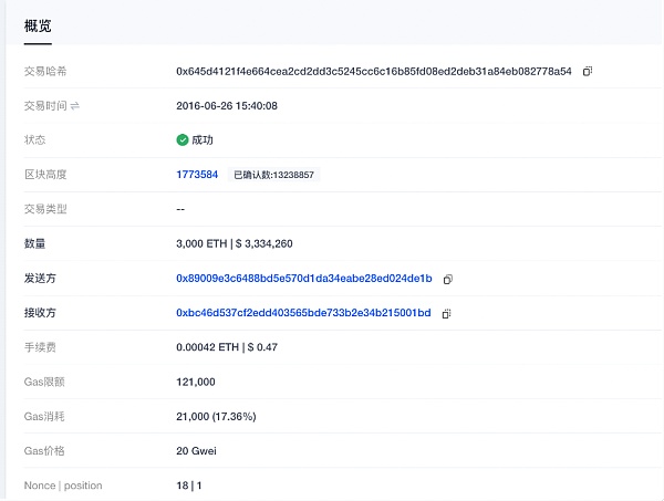 2016年6月17日,黑客利用The DAO项目的「递归调用」和「调用转移避免销毁」两个漏洞,进行了两百多次攻击,总共盗走了360万ETH,接近该项目筹集的以太坊总数目的三分之一。(360万ETH,当时价值超6,000万美金)