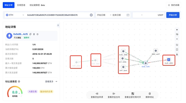 「0x8bf6」的资金来源比较繁多,其中最大单笔转账为1万 ETH,共计19笔。这19笔中的一笔,即1万ETH的转账,经过多层反溯,由「0x977a」发送。