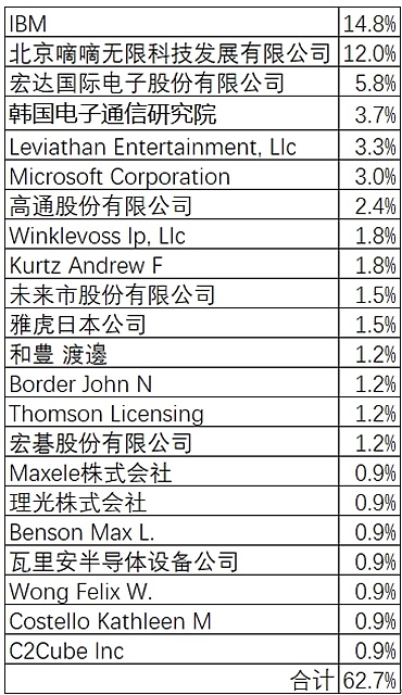 表1 专利文本中提到metaverse的专利权人分布(数据来源:谷歌专利)