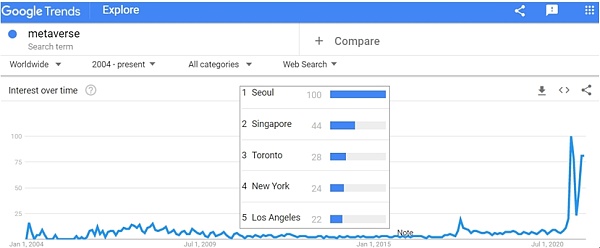 把上述专利、标准、开源项目等Metaverse技术研发相关的时间线,与谷歌趋势反映的结果相比较,我们看到,虽然近一年和近五年的Metaverse的谷歌趋势都是中国贡献的流量第一,但把时间放长,2004年至今的谷歌趋势(图2)是韩国独占鳌头,而且2007前后的相对高坡与上述技术时间线反映的情况基本一致。