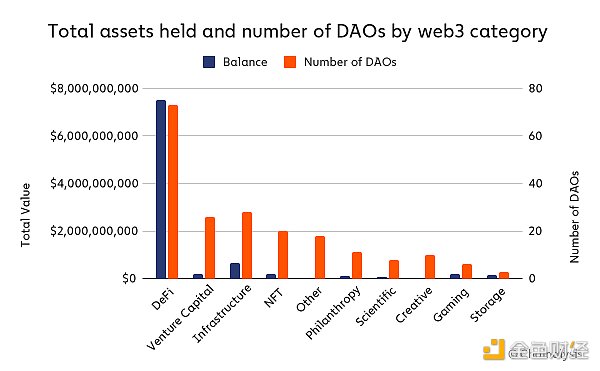 还有大量专注于风险投资、基础设施和 NFT 的 DAO,这表明 DAO 对投资者、开发人员和艺术家具有吸引力。然而,他们的链上国库相对较小。