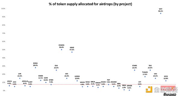 首先,让我们看看每个项目分配给空投的代币供应百分比的分布: