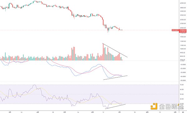 BTC依旧小幅震荡,整体处于6月初周线大阴插针下影线范围内,前期插针后续往往还有个再次试探的动作,不过按目前走势,除非放量砸破前期低点,否则形成双底或者底背离的概率大,那么后面就有望迎来强势反弹,前低附近有周线1.618、长期上行趋势线和月线多重支撑,除非收线有效跌破,否则就有再次震荡筑底的机会。