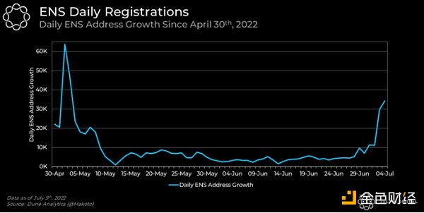 最近每日ENS注册飙升,在7月4日达到超过3万个新地址。分析称,这种飙升可能是由于ENS地址000.eth以破纪录的300 ETH被购买。