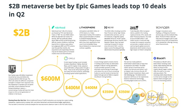 在大型交易中,元宇宙和Web3是一个持续的主题。今年4月,在线游戏《堡垒之夜》的开发商Epic Games宣布了一轮20亿美元的融资,旨在加速其元宇宙计划的进展。本轮融资参与者为索尼集团公司和乐高集团控股公司KIRKBI。三家公司准备联合在体育和游戏领域开发新的虚拟制作项目和数字粉丝体验,从而影响娱乐和数字游戏行业的未来。