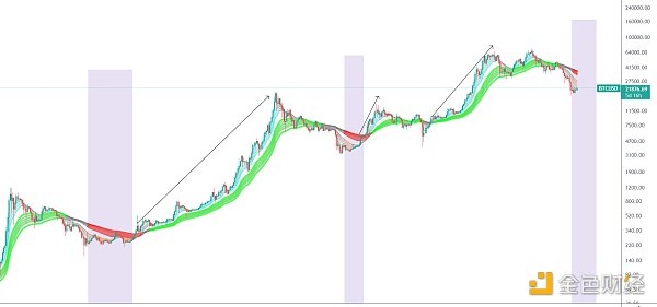 如图所示,BTC最高反弹到23000附近便遇阻回落,已经处于图中红色轨道压制区23000-24000,前期自轨道由绿转红,BTC便一路下滑到后期加速,期间几次反弹均被轨道压制,后面重新站上才有望迎来趋势反转,并且这一带也是前期日线下跌中继顶部区,同时也是下方周线下滑中轨线和前期大阴1/2位,所以压力还是比较重的,一次性过不去一般就会回调整理,蓄势后再次向上冲击,多次试探后面突破的概率就大了,我们从下图可以看出BTC已进入红色区域,前期转红是在2014和2018熊市底部,震荡筑底后向上发力重新站上,启动后面牛市,包括2020年3月大瀑布,BTC从轨道下方低位重新站上,展开本轮大牛市,所以本次也是有望走出筑底行情,短线在未有效突破前,依旧可以考虑逢高减仓。