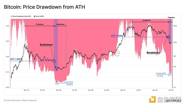 2021年11月-2022年7月:当前的熊市经历了75%的峰值回撤,29k美元的底价也是一个类似的基础水平断点。在6月中旬的最新一次投降中,价格在短短两周内下跌至17.6k美元,跌幅为40%。