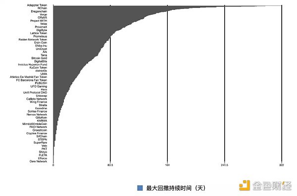上图是「最大涨幅的开始时间的频数」,x 轴为时间,y 轴为频数,图中的柱表明:币种都是在什么时间见底的。见底时间集中在 2020 年 3 月和 2021 年 7 月,也就是「312」和「519」惨案之后见底。