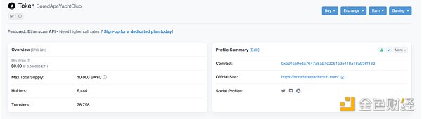 现在我们来到了Etherscan的BAYC页面,我们可以在页面上方看到这个项目的一些具体信息,比如项目的最大总供应量、NFT持有者数量,以及当天为止代币的转移数量。