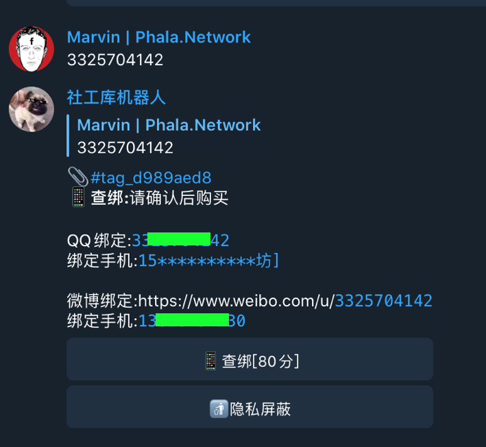 此灰产工具宣称自己是“全网独家数据”,外面的查绑基本都是在机器人查询的。请注意该查询非实时绑定信息。
