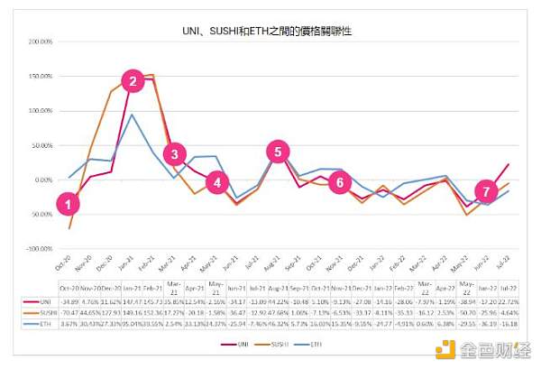 下图说明了UNI、SUSHI和ETH之间的价格关联性,以及一些需要注意的关键事件。