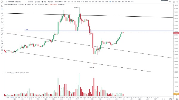价格在突破前期震荡箱体上沿3.5美金阻力位后,这几天推土机方式持续上行,目前已涨至60日线附近,中短期5-20日均线顺向多头排列,其余指标上也都保持向上发散的姿态,显示近期走势整体的强势姿态,目前上方短期压力4.1美金,为前期日线双顶颈线支撑位,这个位置有效突破,才会继续拉大上涨空间,下一强压位于4.45美金附近,操作上短线可继续沿5日线持币,跌破就要先止盈。