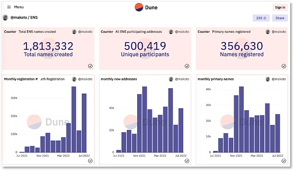 7月还没有结束,在以太坊域名服务平台ENS上,有326800个以「.eth」结尾的域名在这个月内被注册。Dune Analytics 数据显示,7月的注册量截至目前仅次于今年5月的365652个,而ENS域名的创建总数已超过181.33万个,参与注册的独立地址数超50.04万个。