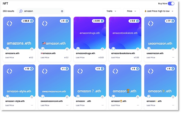 目前,NFTGO数据显示,含有Amazon(亚马逊)字样的ENS域名有269个,挂售价在0.013 ETH到100万亿ETH不等,而实际成交的相关域名最高价为0.2 ETH,为「amazons.eth」,折合416美元,目前挂售价为88.8 ETH,相当于12.58万美元;另一个在amazon前加了一个美国国旗图片的域名是最新成交的,成交价也仅为0.2 ETH。