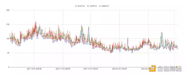 BendDAO 采取的 NFT 定价方式就是典型的 TWAP 定价。其通过和 chainlink 合作,调用多节点采集所抵押的 NFT 在 Opensea 和 LooksRare 两个交易平台的地板价,调用合约接口将地板价喂到链上后计算出对应的 TWAP,从而过滤掉交易平台价格波动的影响。由下图可见对 cryptopunk 这一藏品,预言机提供的地板价和成交均价、TWAP 是保持一致的。