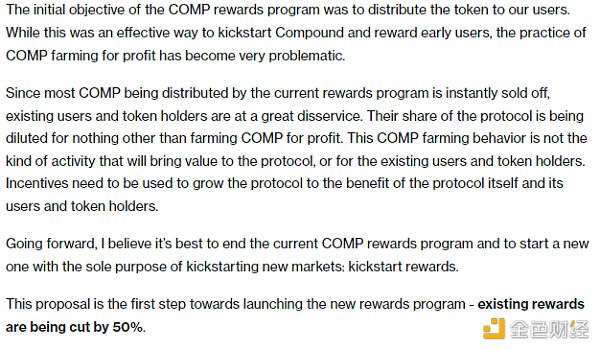 2 年后,Compound 最终削减了 50% 的奖励,并承认分发的 COMP「立即被出售」,因此代币持有者「被稀释,只是为了获利而种植 COMP」。