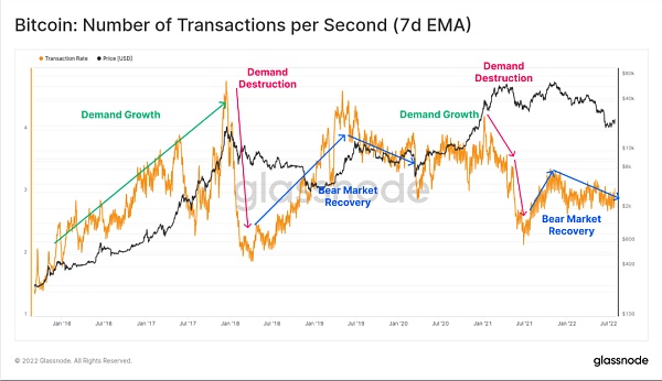 在 2021 年 5 月的Token价格和链上需求暴跌之后(红色),交易需求横盘整理但只是小幅走低,这表明信念坚定的交易者和参与者的稳定基础仍然存在。