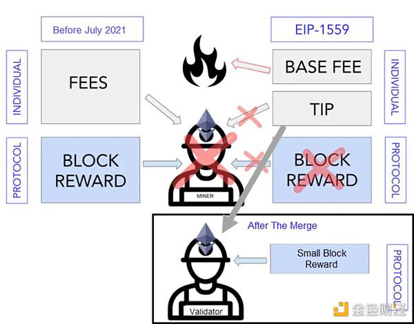 2021年7月,作为伦敦硬分叉的一部分,以太坊改进提案(EIP) 1559生效。它改变了以太坊的收费机制。此前,矿工获得了区块奖励和交易处理费用。现在,他们仍然会获得区块奖励,但费用会被分为基本费用和小费。如果用户希望提高交易的优先级,他可以添加小费。然而,基础费用(在ETH奖励中)会被销毁,这将减少ETH的供应。