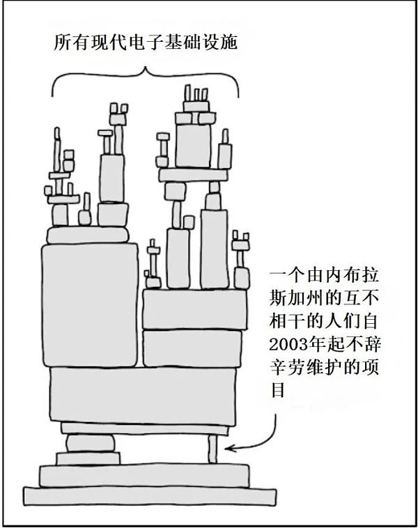 多数情况下,独立开源软件开发者的收入与其创造的价值,或者在传统技术工作中获得的薪酬相比,简直少得可怜。结果就是开源项目价值很高,但资源匮乏,这带给我们感受开源运动影响的另一个角度——当开源软件出现问题的时候。"心血漏洞"给活跃服务器中 20% 的软件注入了漏洞,引发海量的攻击,包括造成美国医疗系统中 4,500,000 名病人的记录被盗。最近,在某个关键协议中出现一个叫做"Log4j2"的漏洞,它所造成的数据泄露波及了从苹果到 Minecraft 的所有用户。下面的这幅 xkcd 漫画既好笑又吓人,而且非常传神。一句话:开源软件尽管有着巨大的价值,但许多关键项目却仍然因为公共物品的困境在挣扎求存。