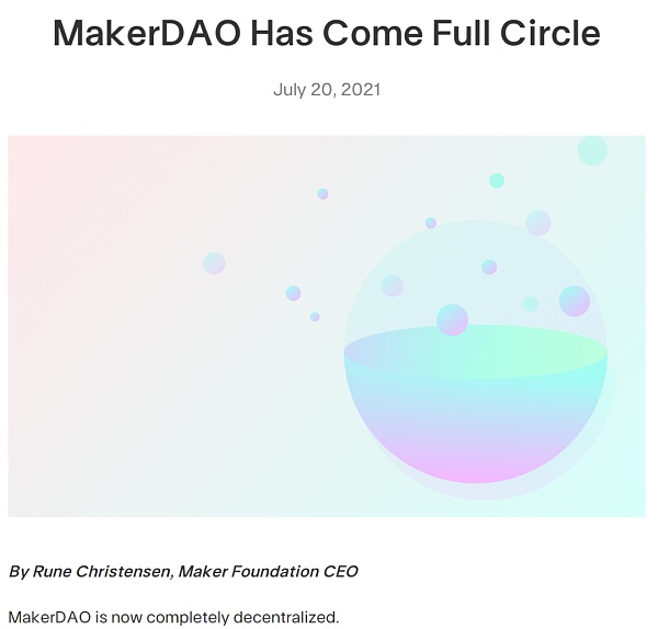 MakerDAO创始人Rune Christensen在2013 年 3 月第一次通过Reddit 向世人展示了 Maker 的愿景,即创建一个由以太坊支持的美元稳定币,于2014年正式成立MakerDAO成为了以太坊上第一个去中心化自治组织(成立时间),2015年3月Maker协议雏形诞生,创始人 Rune Christensen在 Reddit 上与以太坊社区的成员包括 Vitalik Buterin 分享了协议的设计、合约代码以及测试前端,并且在2015年至2017年之间与来自全球的开发者开始了对代码、架构和文档的第一版迭代。2016年中,MakerDAO发布了以太坊上第一个去中心化交易平台:OasisDEX(现为Oasis.app)。2017年12月MakerDAO正式在以太坊上推出第一版MakerDAO白皮书向大家介绍了DAI稳定币系统。创始人Rune Christensen在 2021 年 7 月 20 日发布了一篇博客文章《MakerDAO Has Come Full Circle》宣布Maker基金会已经完成了它的使命并将会在未来几个月解散并完全交给社区管理实现了真正的去中心化。