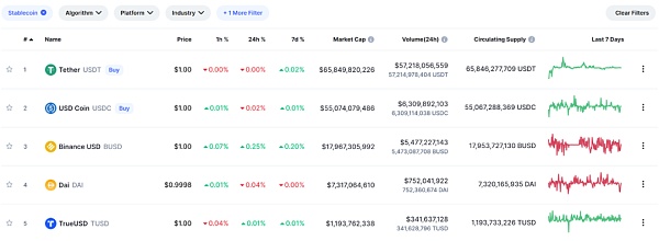 DAI是一种在MakerDAO上通过Maker协议超额抵押产生的与美元挂钩的去中心化稳定币,总供应量取决于在Maker协议上抵押物的价值,截止至2022年7月26日DAI一共被铸造了7,320,165,935枚,在所有稳定币中总市值排名第四,是目前市值最大的去中心化稳定币。