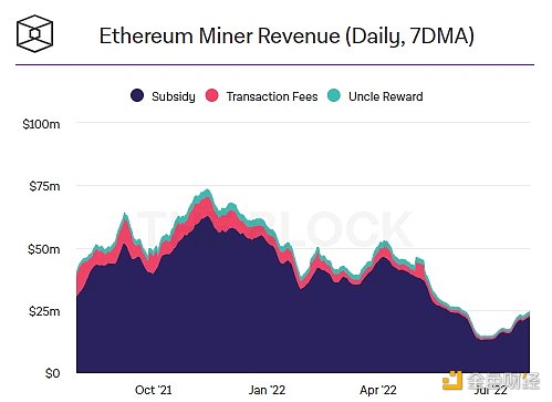 在伦敦升级开始前,有部分矿池和矿工因担心这次升级会导致自身挖矿收入降低而反对此次升级,甚至扬言要分叉以太坊,但最终由于势单力薄而不了了之。8 月 29 日,The Block 发表报道称,虽然作为 BaseFee 的以太坊被销毁了,但矿工以美元计价的收入基本保持不变,一方面是由于以太坊价格上涨,另一方面则是由于 NFT 市场的火热导致小费(Tip)收入挽回了部分因 EIP-1559 导致的损失。