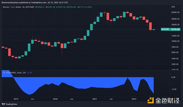 自 2020 年以来,比特币与美国联邦基金利率基本上呈负相关。