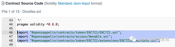 在这里,根据合约作者验证方法的不同,你有可能会看到一个很大的文件,在这个文件中包含了所有用到的合约,或者是像 Doodles 这样,是很多分开的文件。这里能看到多个合约的原因是,一个合约中经常会引入别的合约。通过引用,合约可以重复使用其他已经验证过的合约,比如说在 Doodles 项目中用到的 OpenZeppelin 的 ERC-721 和 Ownable 合约。