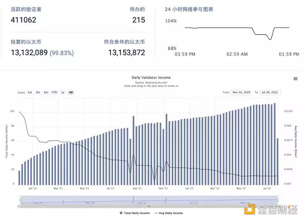 截至 7 月 29 日,信标链运行平稳。链上数据显示,信标链已拥有约 41.1 万个节点,累计质押总额约 1313.2 万 ETH,其中有效投票参与率达 99.83%。另外,自 2021 年 10 月 15 日至今,节点数量和质押总额稳步增长,每日验证者收入也在缓慢增长中,目前,信标链每日奖励量约 11 万枚 ETH。