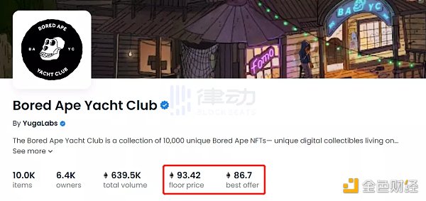 ? 交易者如果想以一个公允价值快速售出 NFT 了结头寸,往往要忍受巨大的滑点损失。以上图的 BAYC 在 OpenSea 上的交易情况为例,地板价为 93.42ETH,而最高的 offer 只有 86.7ETH,如果有一个持有者想快速售出他的 BAYC,要忍受至少 6.72ETH 的滑点(这还不包括交易手续费和版税)。
