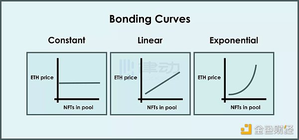 但 uniswap 采用 x*y=k 恒定乘积算法并不适用于 NFT 市场,本质上是因为 NFT 与 FT 的交易市场天然的结构不同。NFT 的总量在 10,000 以下的项目最为常见,而 FT 的数量则动辄以亿为单位,数量悬殊导致了 NFT 交易市场的深度明显不足。因此?sudoAMM 采用了联合曲线(线性和指数)来促进 NFT 的交易,自动调整买卖双方的报价提高了交易者和流动性提供者的灵活性。
