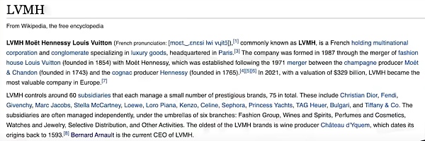 Alex除了Tiffany的CEO之外还有另一个身份,LVMH Group是世界上最大的奢侈品牌集团,从维基百科中我们可以找到,包括LV、Christian Dior、Fendi等一些我们耳熟能详的奢侈品牌都是其旗下子品牌。LVMH Group创始人为Bernard Arnault,Alex则是其子女之一,我们前面所提到的TAG Heuer品牌手表的CEO则是其另一位儿子。