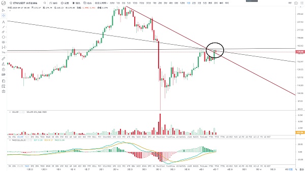 目前ETH这个位置上方的压力还是比较重的,首先前期顶点288美金回落的日线下降压制线,以及17年牛市顶点回落的长期周线阻力线,还有近期反弹高点176美金一线的压力,也是60日均线压制区,多重阻力汇聚一起形成共振阻力带,大致阻力区间处于175-178一线,这个位置要么持续放量强势突破,要么区间下方反复研磨消耗上方阻力再择机突破,后面上行空间才能打开,昨日一波放量反弹,也是直接反包前几日的阴线,解放了近期一路回落的套盘压力,短线多头优势明显,后面就要观察能否继续上攻关键阻力区,再未有效突破前,建议观望。