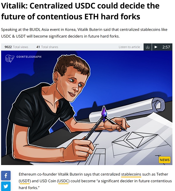 以太坊创始人Vitalik Buterin在8月3日首尔举行的BUIDL Asia上发表了自己的观点:“中心化稳定币可以决定‘有争议’的硬分叉的未来”。可以看出,中心化稳定币的发行方在硬分叉中起到了决定性的作用。