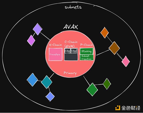 对于 Avalanche 来说,他们的主要扩展主张是允许轻松创建单一区块链 -- 即其子网(Subnet)。Avalanche 的架构类似于下图所示: