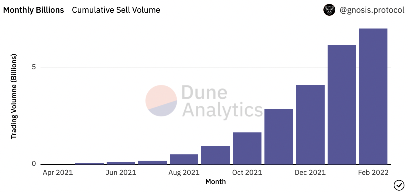 CowSwap 采用批量订单按统一价格结算(无法完全匹配交易时,按照 AMM 价格统一),没有交易排序的问题,从根本上免除了 MEV,同时也降低交易摩擦。通过 CowSwap 实现的交易额在其推出的近一年来迅速增长,目前成交总额达到 50 亿美元。