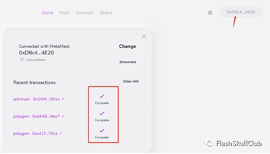 链接好钱包以后,在[send]页面选择需要跨链的币种以及需要把资产转移到哪条链即可,首次操作需要进行一次授权。由于目标是刷空投交互,建议选择polygon/optimism/arbitrum三条链互转,gas成本比较低。跨链会收取手续费,L2的gas费很低。