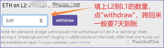 如果需要将L2 Arbitrum网络的资产跨链到L1以太坊网络,在MetaMask钱包选择Arbitrum网络。打开Arbitrum跨链桥地址,可以看到L2账户的资产数量,输入数量,点击[withdraw]按提示操作即可。但是Arbitrum资产转到L1以太网络,需要等到45818个区块,也就是好几天,着急到账的可以考虑其他跨链桥产品。