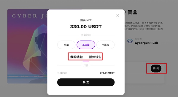 在 Cyber Journey 盲盒区域点击「购买」,支持单抽,五连抽和十连抽。