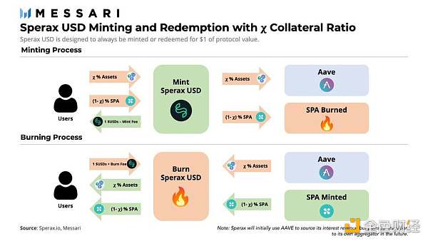 迄今为止,我们还没有看到一种去中心化的稳定币为其持有者提供原生收益。Sperax 旨在通过即将推出的稳定币 Sperax USD ($USD) 来改变这种状况。Sperax 是总部位于硅谷的一家区块链公司,其使命是构建世界上任何人都可以访问的 DeFi 基础设施。Sperax 的稳定币模型使用户可以随时存入或赎回 1 美元的协议价值,与 1 美元法币进行交换。与 FRAX 类似,支撑 Sperax USD 的抵押品,分别包含外部加密资产形式的外源抵押品,以及 SPA 形式的内源抵押品——SPA 是 Sperax 的原生治理代币,同时可以吸收波动性和累积价值。外源和内源抵押品之间的平衡将由协议的动态抵押品比率决定。