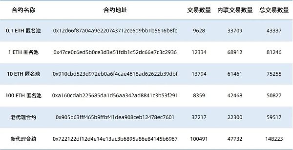 可以看到,在启用代理合约后,大量交易都是通过代理进行,通过匿名池交易量占比图(下表)可知,1 ETH 匿名池(33%)和 10 ETH 匿名池(30%)是使用最多的匿名池。