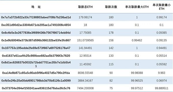 对所有交易进行存款、提款归类后,统计了每个地址存/提款总额(单位 ETH) 、次数、最大存/提款金额、最小存/提款金额统计。得到了 22714 个存款地址,31737 个提款地址,其中存/提款总额 Top 10 数据如下: