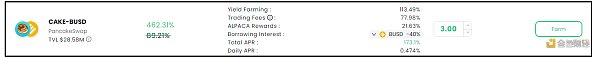 Alpaca Finance的截图显示了CAKE-BUSD货币对的收益率细分