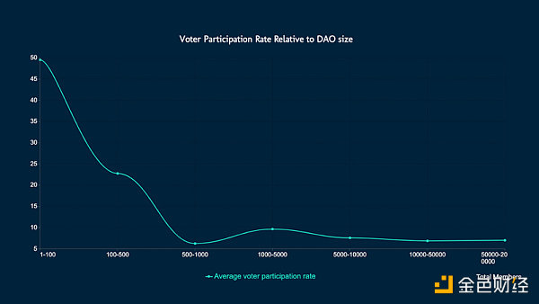 DAO 的规模越小,该指标的相关性就越大。您可以在下面注意到,最大的 DAO 通常是参与率较低的那些。这背后的原因是它们主要是大型协议 DAO,其中集体决策目前仅限于边缘问题。