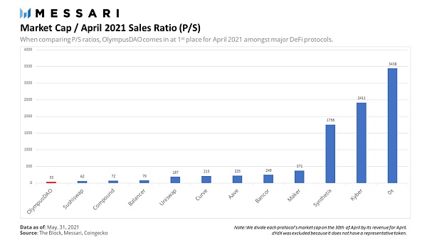 如果我们把每个协议的代币4月30日的市值除以其4月份的收入,就可得到简化的 4 月市销率 (P/S)。如图所示,OHM的市销率最低,它创造与其市值成正比的收入的能力很强,在4月份所有DeFi协议中鹤立鸡群。