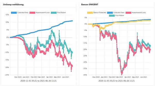 对Uniswap和Bancor池的比较分析表明,Uniswap上的流动性提供者最终获得的回报,往往比他们通过“持有”所获得的钱要更少,而Bancor上的流动性提供者总是在完全的无偿损失保护实现时,优于买入并持有策略。