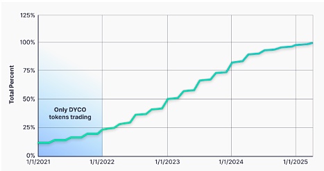 DAO代币将通过释放65%动态代币发售(DYCO)。代币还将通过收费桥( toll bridge)确认归属。虽然TGE的标准分配是20%,之后连续四个季度每季度20%的方式,但DYCO参与者有机会通过支付通行费来提前领取所有代币。