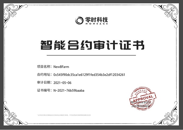 NewB.Farm收益农场智能合约符合零时科技安全审计标准,审计结果通过。